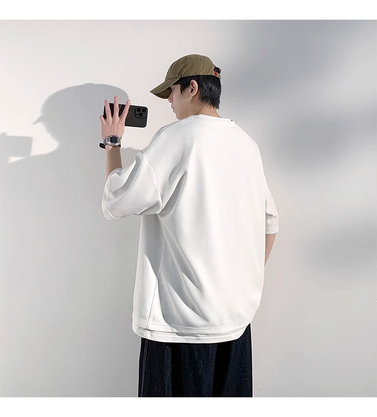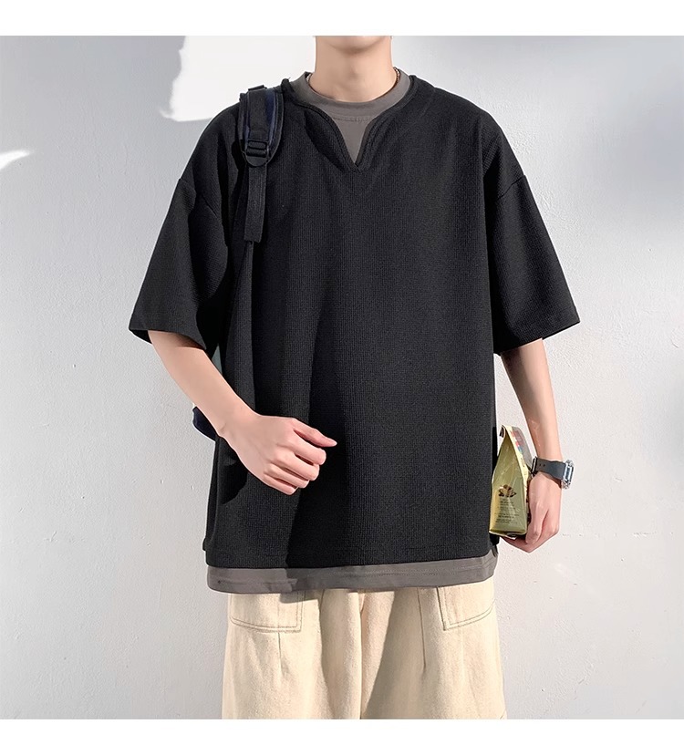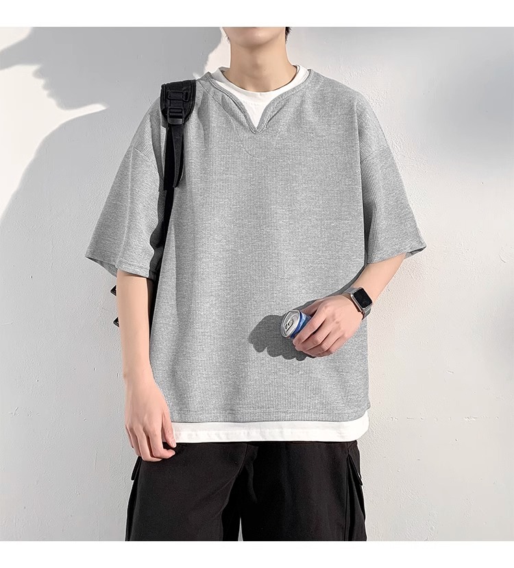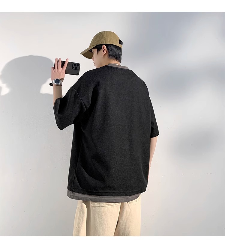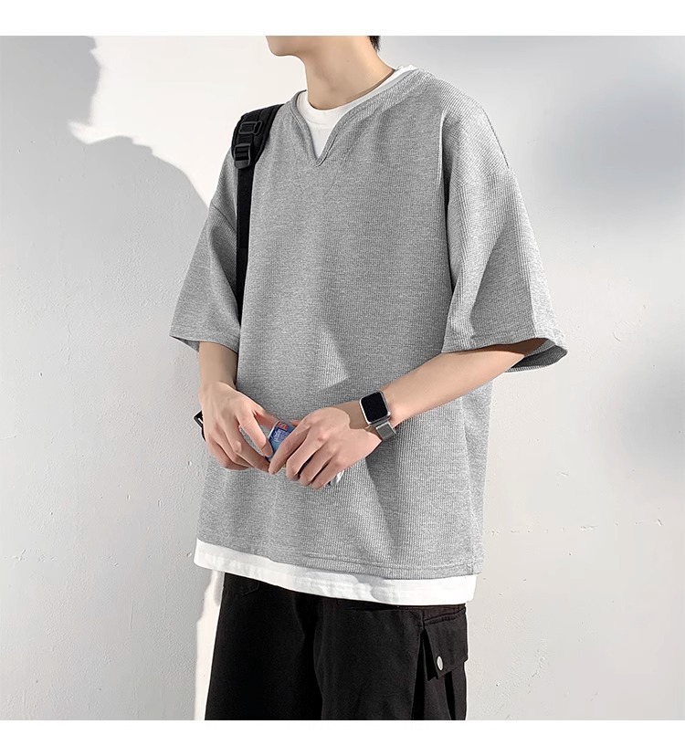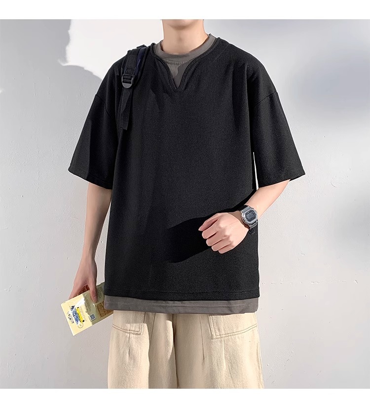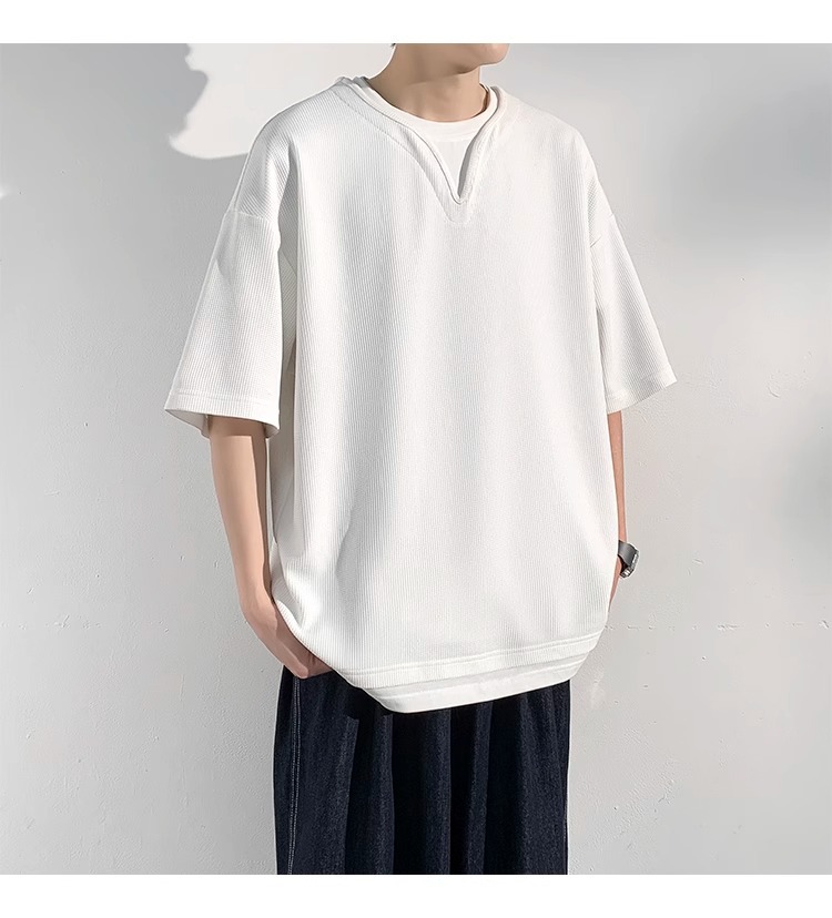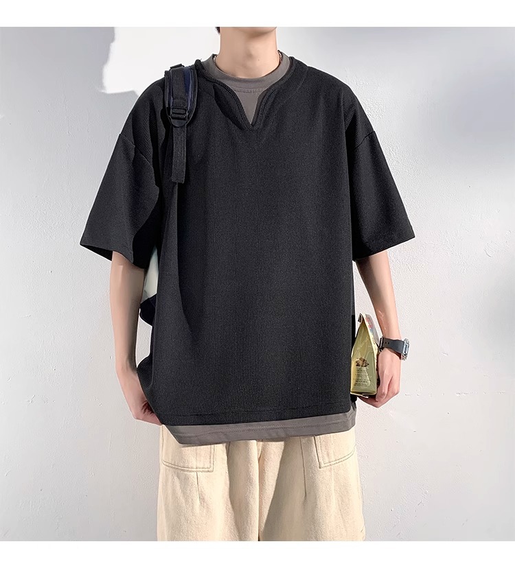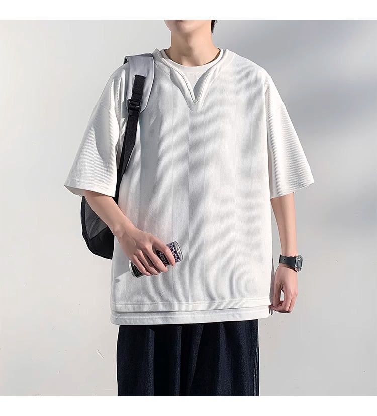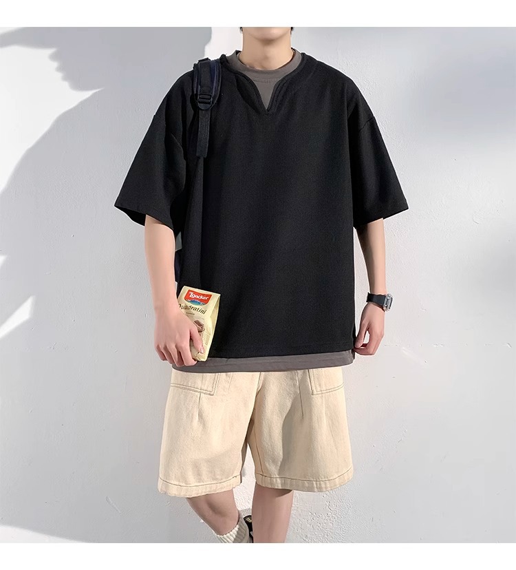 • Henry Collar Fake Two Pieces Short Sleeve T-shirt Trendy Men Summer