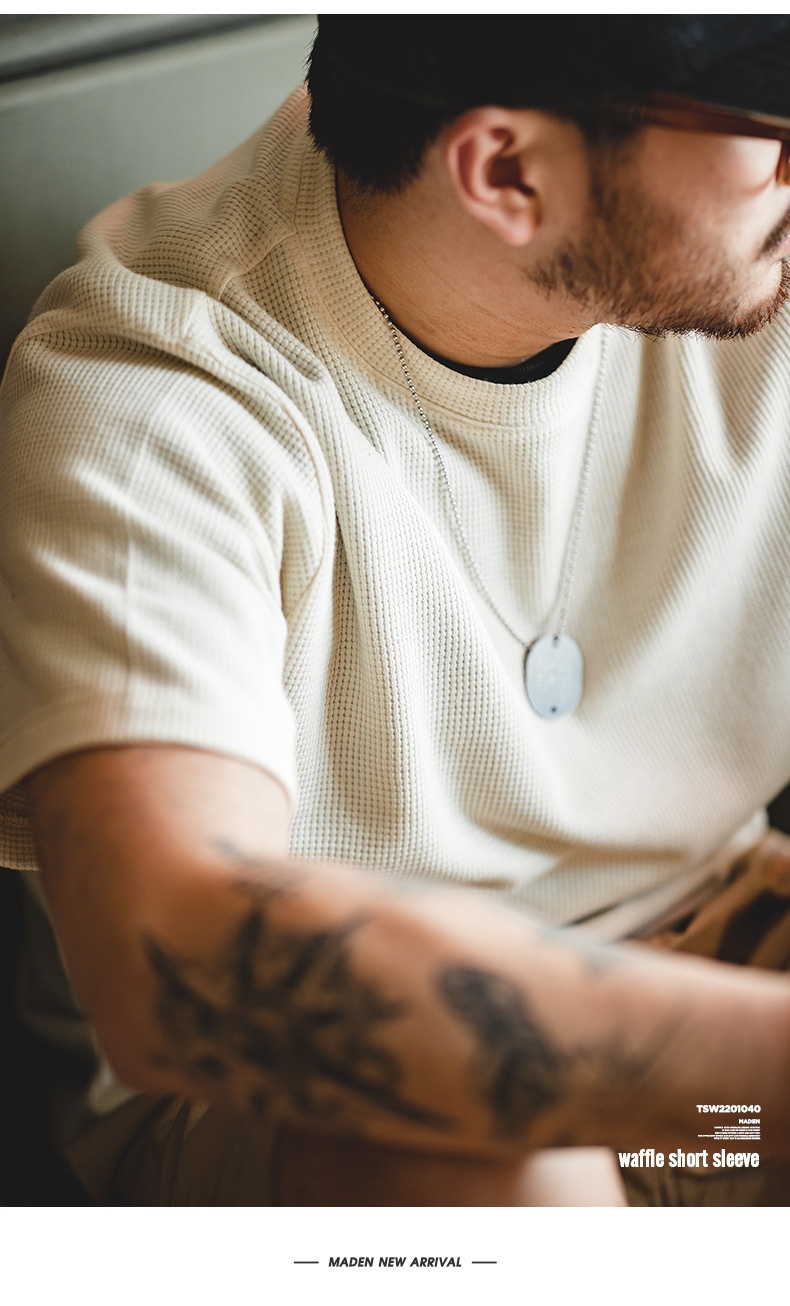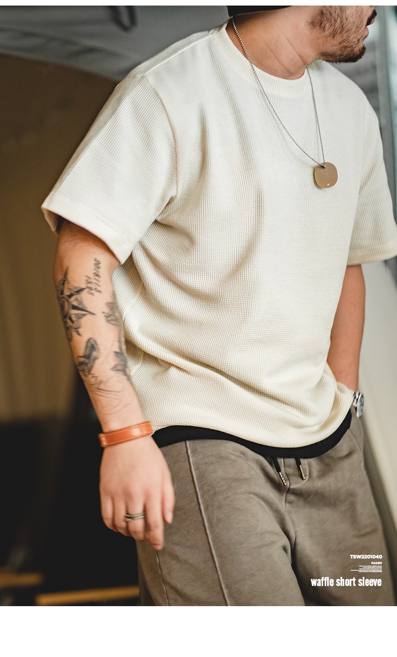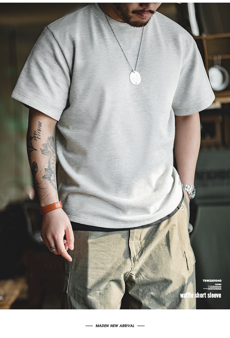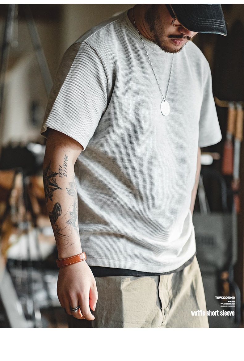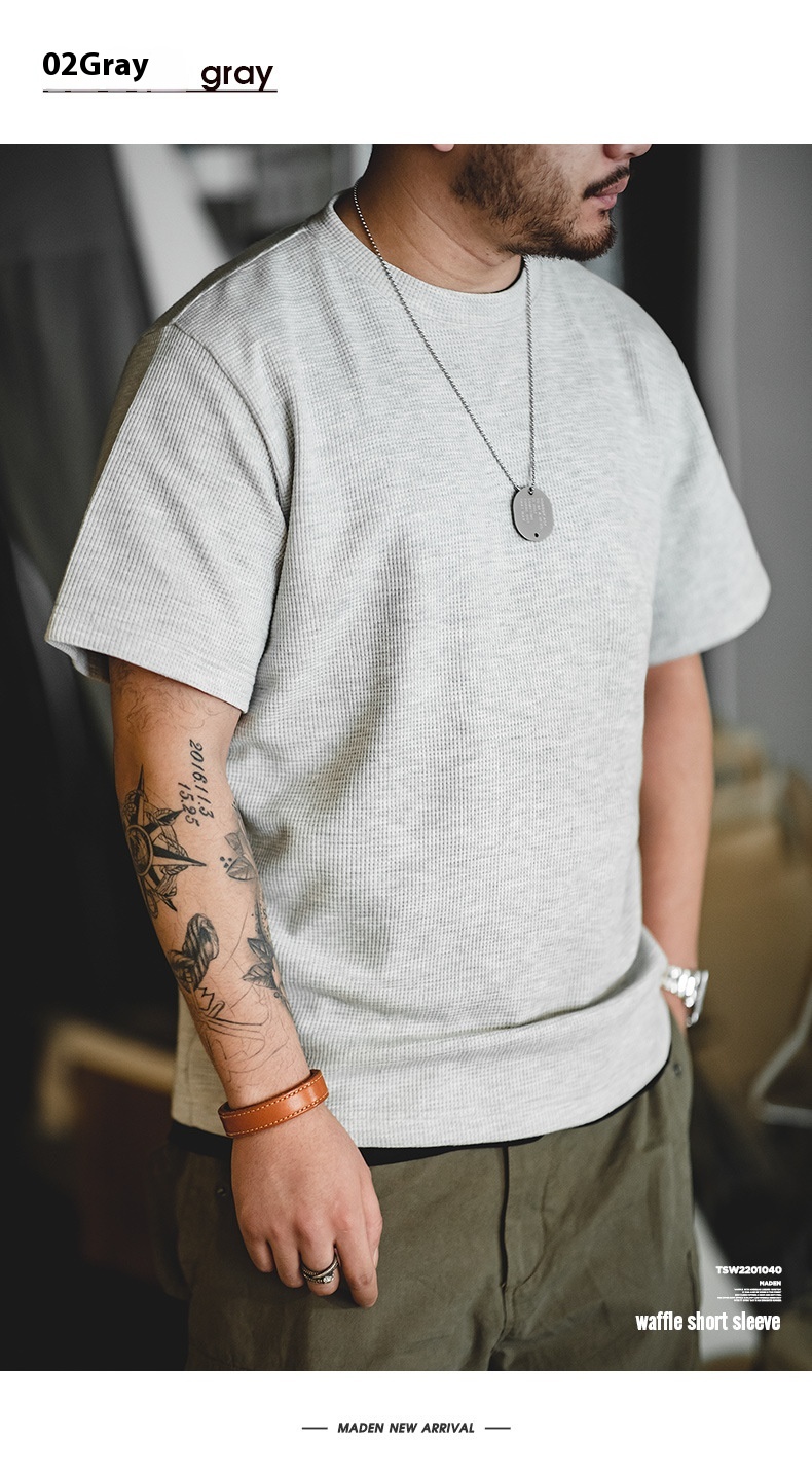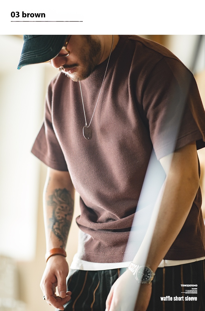 • Waffle Round Neck Knitted Short Sleeve T-shirt Half Sleeve Bottoming Shirt