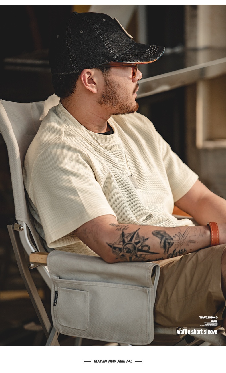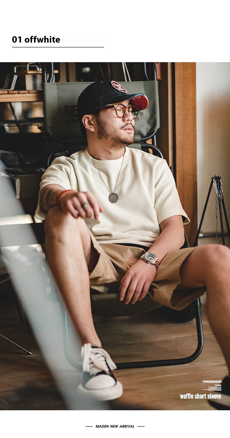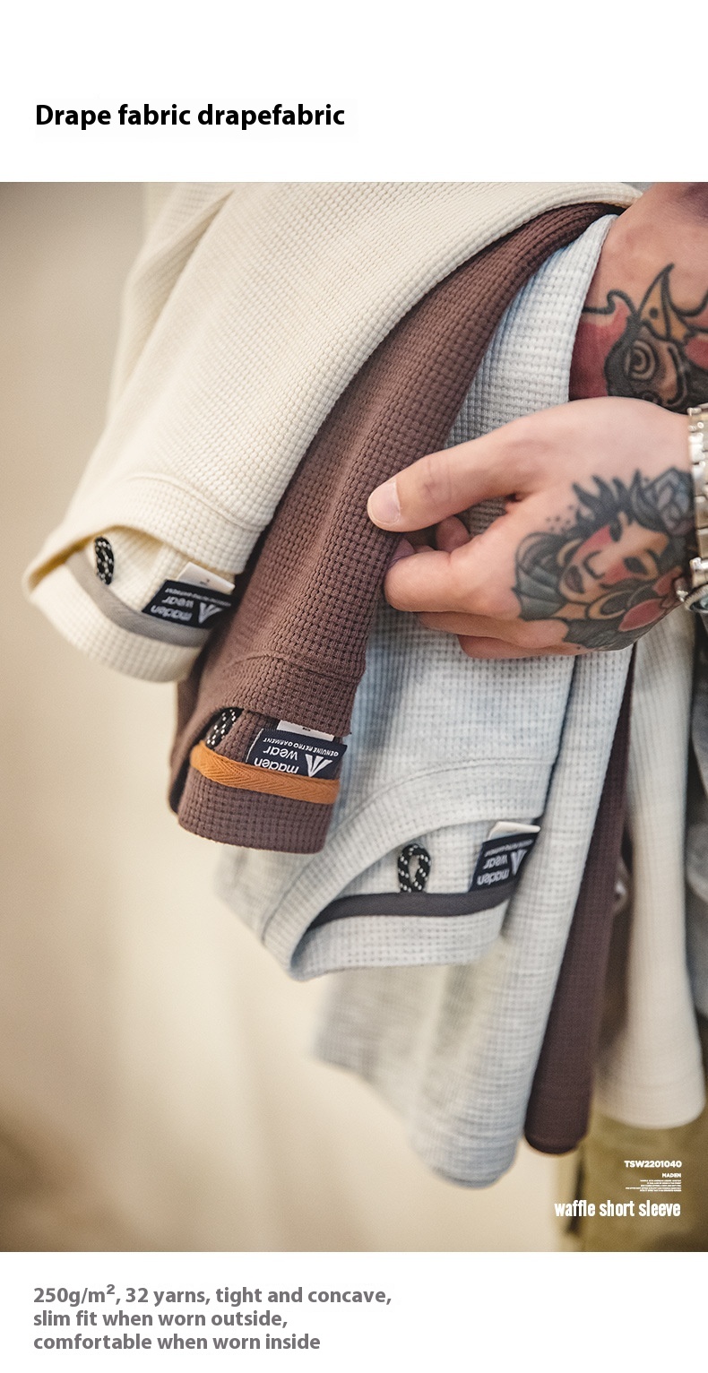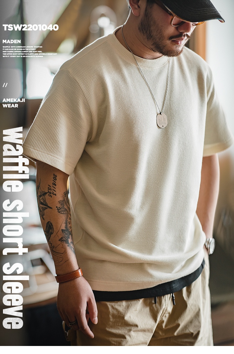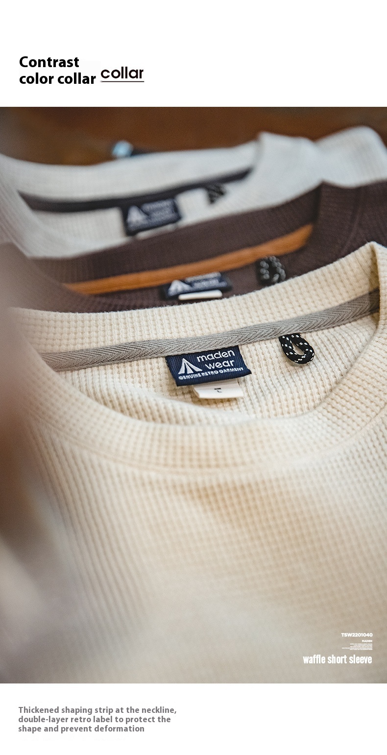 • Waffle Round Neck Knitted Short Sleeve T-shirt Half Sleeve Bottoming Shirt