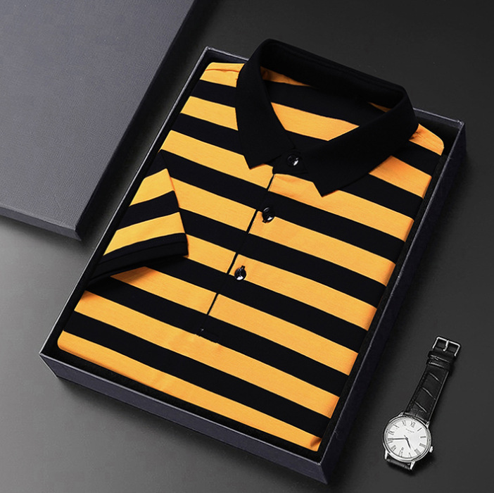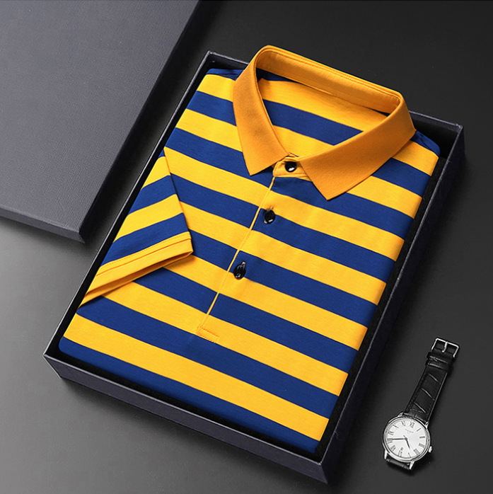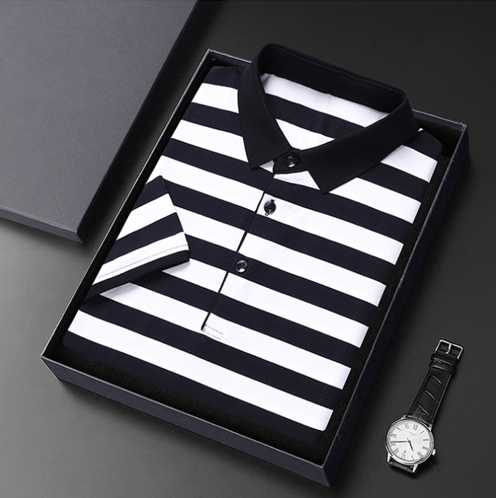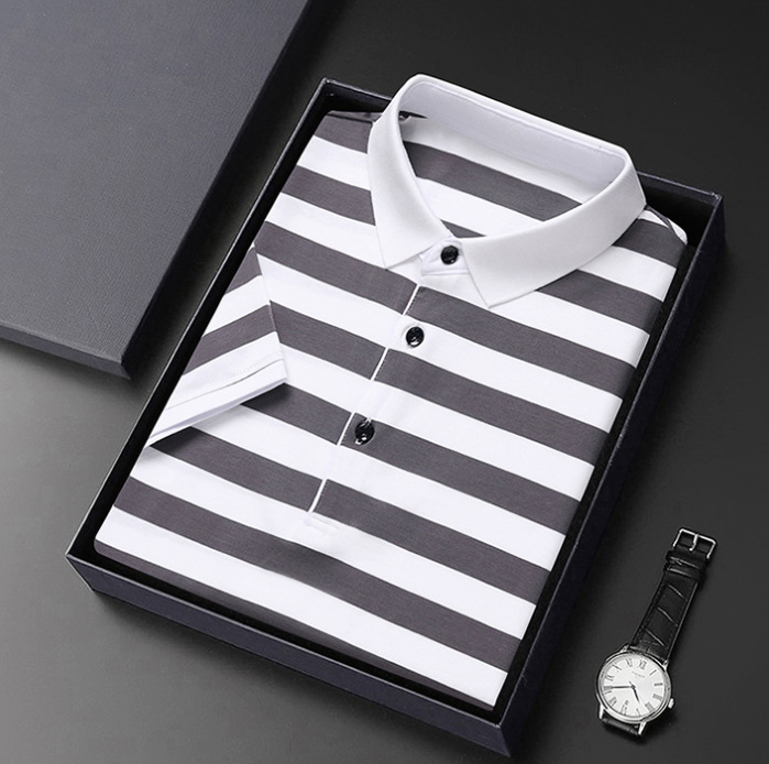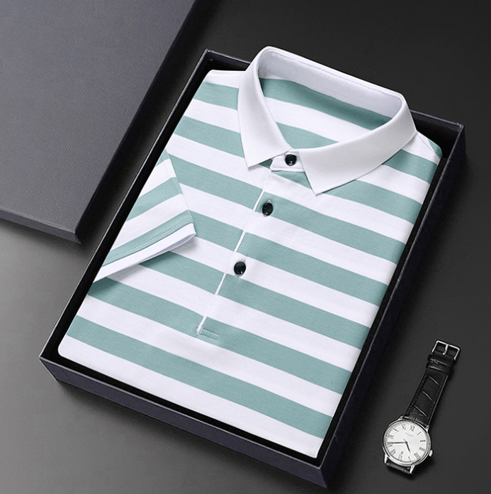 • Summer Short-sleeved T-shirt Men's Cotton Ice Silk Polo Collar Stripes Youth Undershirt