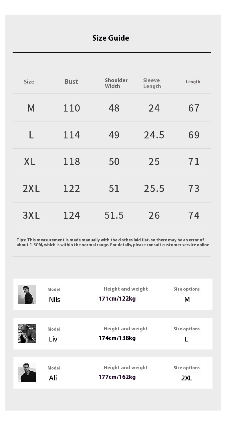 Size: M (170/92A)(recommend 50.00kg-62.50kg,L (175/96A)(recommend 63.00kg-70.00kg,XL (180/100A)) (Recommended 70.50kg-77.50kg, 2XL (185/104A)(recommended 78.00kg-87.50kg, 3XL (190/108A)(recommended 88.00kg-95.00kg)