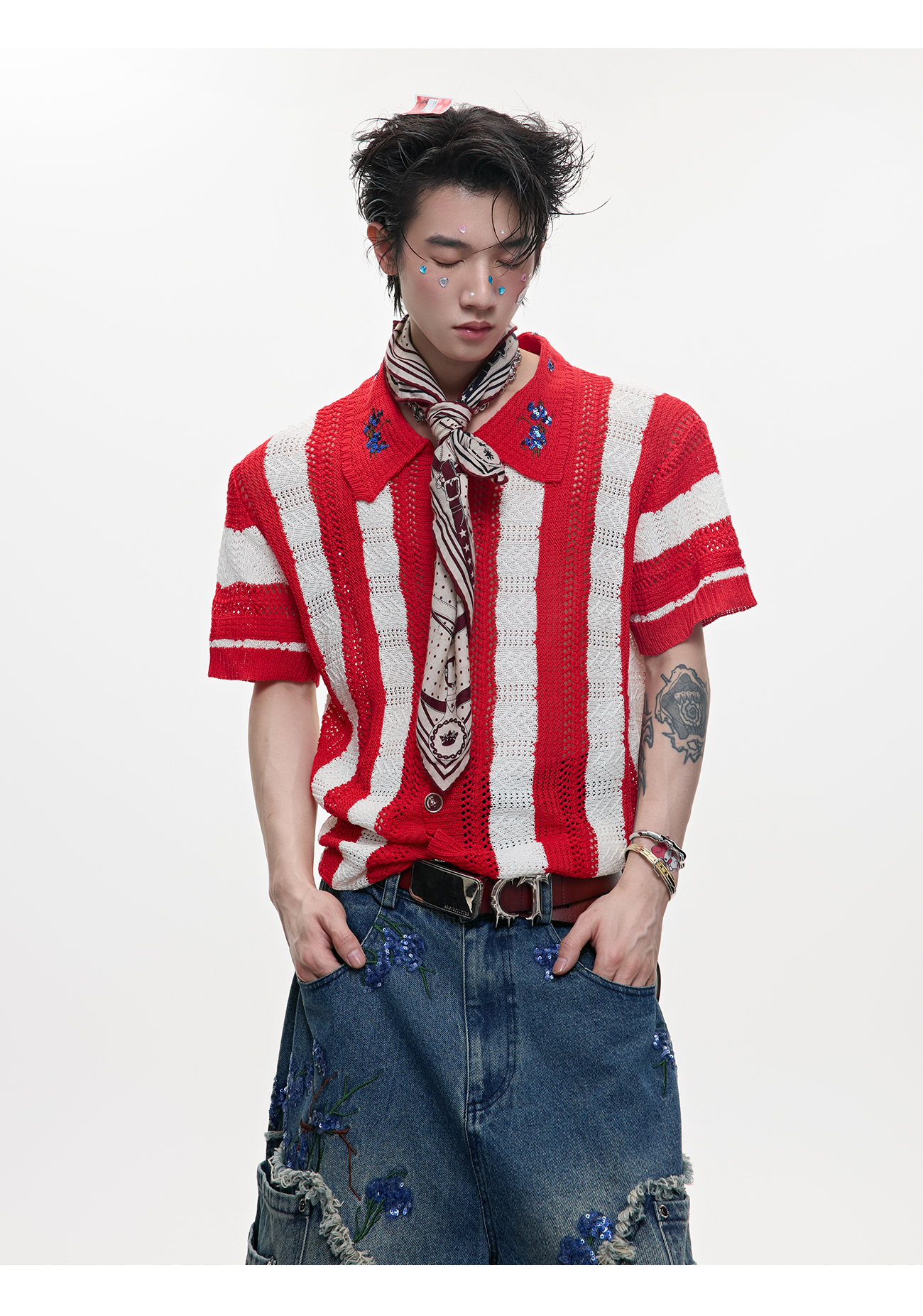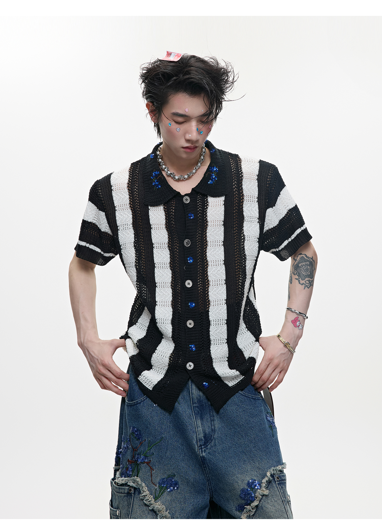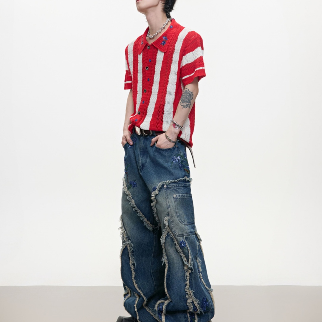 • Men's Patchwork Striped Niche Retro Knitted Short Sleeved Shirt
